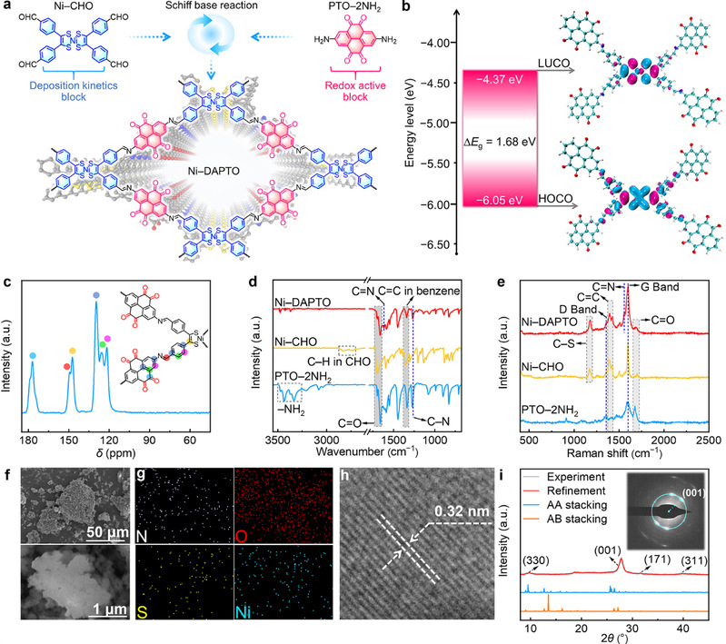 Ni–DAPTO经过醛胺缩聚反应得到。理论计算结果显示在引入Ni配位中心后获得了所期望的低能隙(1.68 eV)。固体核磁、红外、拉曼等光谱表征了Ni–DAPTO的合成。SEM、TEM表征了Ni–DAPTO的微观形貌,XRD表征了结晶性。