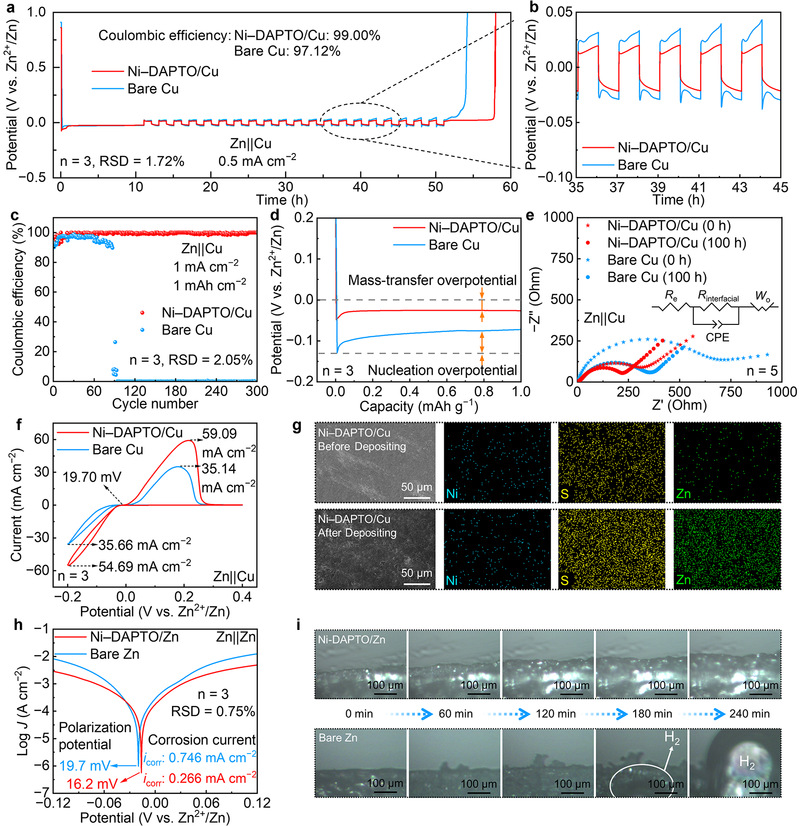 在Zn||Cu半电池和Zn||Zn对称电池中对比测试了Ni–DAPTO在负极修饰后与原始集流体和Zn负极之间的性能差异,表明Ni–DAPTO对Zn2+有良好的沉积引导作用。通过SEM和原位光学直观地观察了Ni–DAPTO作为人工SEI层的Zn枝晶抑制作用。以上都说明了Ni–DAPTO保护层在诱导Zn2+离子均匀沉积和抑制Zn枝晶生长方面发挥了关键作用。这源于Ni–CHO版块中Ni金属位点对Zn2+离子进行的选择性吸附,增强了Zn离子的电荷转移动力学,进而引导Zn离子快速、均匀的沉积。