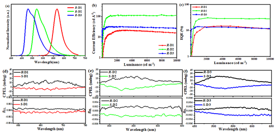 图2.基于非手性铱(III)配合物的CP-OLED器件R/S-D1, R/S-D2和R/S-D3的性能: (a) 归一化的EL光谱, (b) 电流效率– 亮度曲线, (c) 外量子效率– 亮度曲线, (d) – (f)R/S-D1, R/S-D2和R/S-D3的CPEL光谱、gEL -波长曲线.