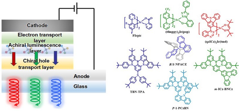 图 1. CP-OLED器件和R/S-NPACZ及非手性发光材料的结构示意图