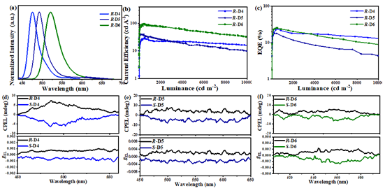图3.基于非手性MR-TADF材料的CP-OLED器件R/S-D4, R/S-D5和R/S-D6的性能: (a) 归一化的EL光谱, (b) 电流效率– 亮度曲线, (c) 外量子效率– 亮度曲线, (d) – (f) CPEL光谱、gEL -波长曲线.