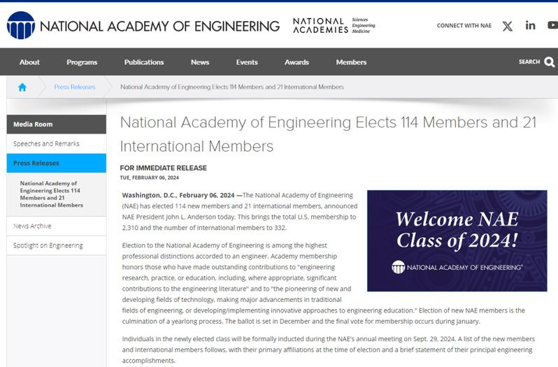 美国工程院成立于1964年,是工程学界的顶尖学术机构,也是美国四大国家学术机构之一(其他三家分别为美国国家科学院 NAS、美国国家医学院 NAM 及美国国家科学基金会 NSF)。