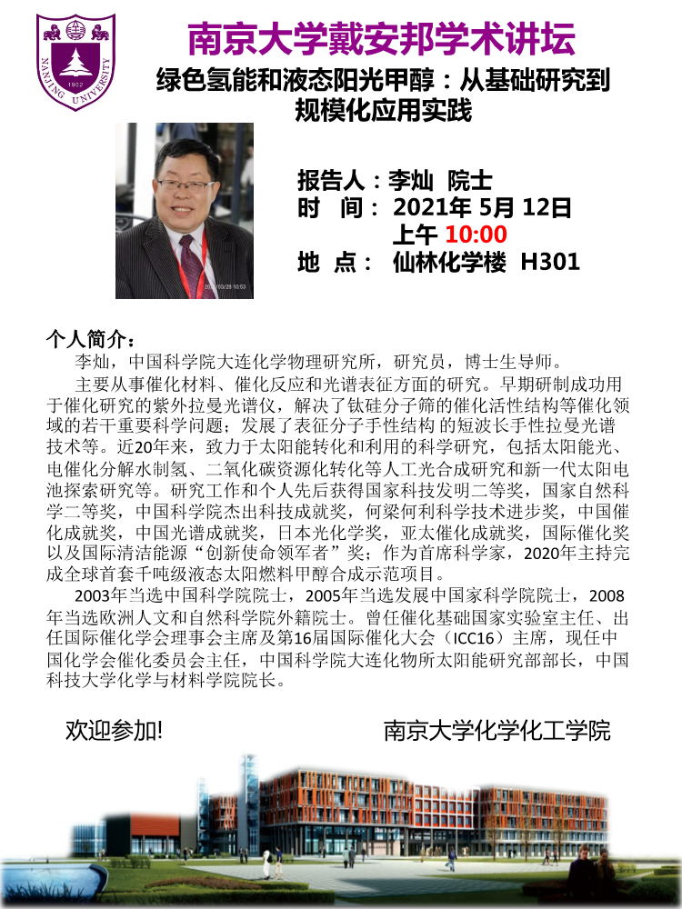 5月12日戴安邦学术讲坛-李灿院士:绿色氢能和液态阳光甲醇:从基础研究到规模化应用实践