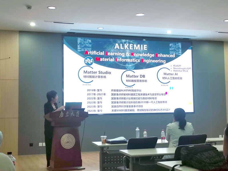 孙志梅教授本次报告着重介绍了她的团队开发的开源高通量自动流程可视化智能计算平台ALKEMIE(Artificial Learning and Knowledge Enhanced Materials Informatics Engineering)。在报告中,孙教授展示了精巧的ALKEMIE自动化流程与框架,它集合了高通量计算模型的构建、材料各种性质计算和数据分析等多个模块,具有用户友好的软件界面,使得材料计算的工作流运行更加高效与便捷。孙教授还生动地介绍了智能计算平台如何加速新材料的探索和研发,包括基于ALKEMIE设计出多类新型信息材料、新能源材料、MBene催化材料等,展示了智能计算平台在材料研发中强大功能。