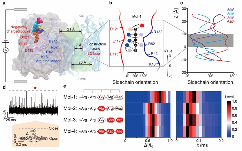 蛋白质是执行生命功能的基石,组成其多肽的氨基酸多为L型手性构型。手性位点差异所形成的差向异构体与疾病密切相关,也是现今多肽类药物合成中难以检出的杂质。通常液-质联用技术是鉴定分子手性的主要手段,但是该方法仅能区分少数含D型手性氨基酸的多肽差向异构体,其原因是L/D型氨基酸酶的酶切位点比较有限。此外,由于单个位点的氨基酸异构化往往较难改变整个多肽分子的手性特征,圆二色性光学方法也较难识别多肽的差向异构体。纳米孔道电化学技术作为一种无标记、高通量的单分子检测手段,可根据不同待测物分子穿过纳米孔道时产生的阻断电流特性,从而在单分子水平上获得待测物的重要化学信息。然而,实现单个多肽分子中的手性氨基酸序列分辨仍面临巨大挑战。