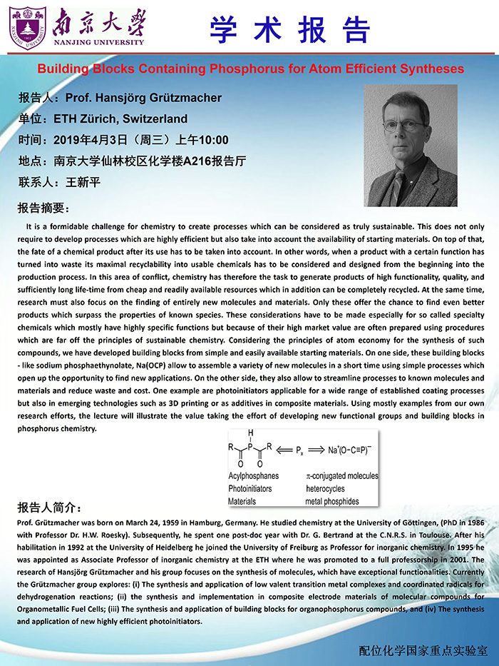 2019年4月3日Prof. Hansjörg Grützmacher学术报告