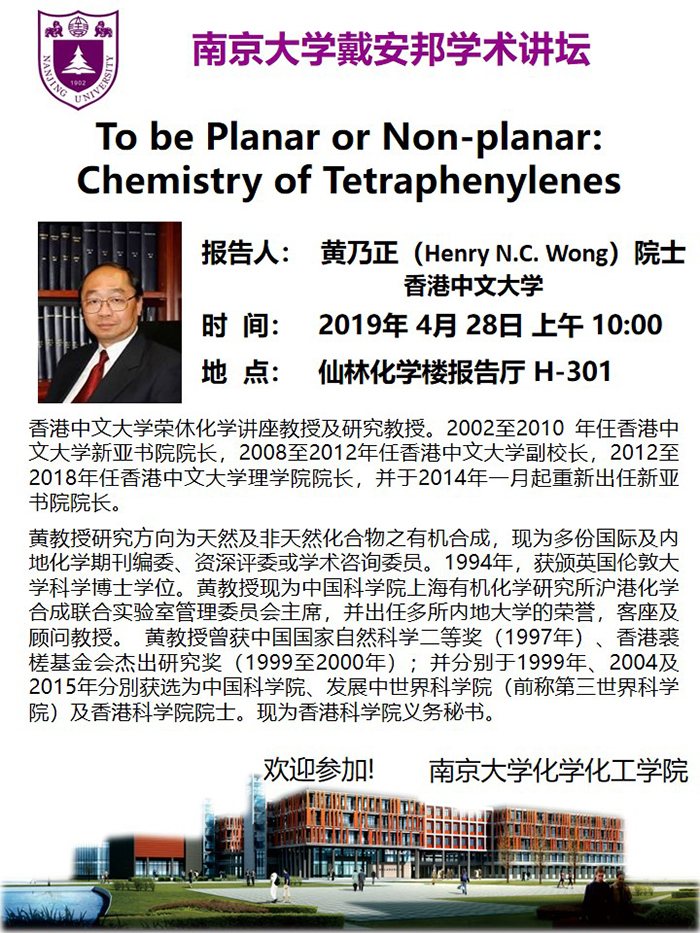 4月28日黄乃正院士:To be Planar or Non-planar:Chemistry of Tetraphenylenes
