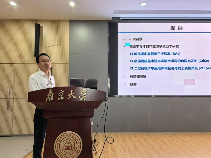 超快光谱成像是表征电荷载流子的重要技术手段,在材料、信息、物理和化学等领域有着广泛的应用。刘新风研究员团队长期致力于开发具有空间、时间和动量分辨率的超快光谱测量系统,研究半导体材料体系中的载流子特性,深入理解其光电特性和相关器件的性能优化。在本次汇报中,刘新风研究员详细介绍了他的团队基于微/纳米超快光谱成像在纳米半导体材料的光谱特性和相关载流子动力学研究方面的一些进展。他利用泵浦-探测瞬态反射显微技术测定立方砷化硼的高载流子迁移率,并测得硒化镉超晶中强电声耦合诱导的自限态发射光谱。同时,他将研究延伸至钙钛矿体系中,以此研究了二维钙钛矿中强电声耦合诱导的上转换荧光的实现。在讨论环节中,师生们踊跃提问,针对“半导体材料合成”、“超快光谱测量与成像”等相关问题与刘老师进行了热烈交流。