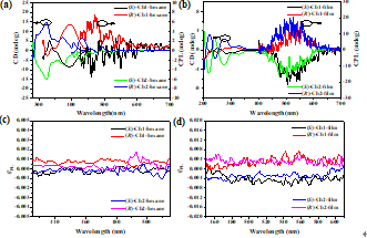(R/S)-Cb1和(R/S)-Cb2对映体在溶液态和固体薄膜态下的CD和CPL光谱均表现出高度对称性。在正己烷中,其光致发光不对称因子(gPL)分别为0.29×10-3/ -0.28×10-3和1.42×10-3/ -1.33×10-3。而在薄膜状态下,(R/S)-Cb1和(R/S) -Cb2的gPL因子分别提高到6.24×10-3/ -6.11×10-3和7.38×10-3/ -7.46×10-3,高于多数有机手性发光小分子,这可能是由于分子在薄膜状态下规则排列导致的。并且研究发现,(R/S)-Cb1和(R/S)-Cb2由于咔唑基团与苯环的连接位点的不同,二者显示了很多不同的性质。