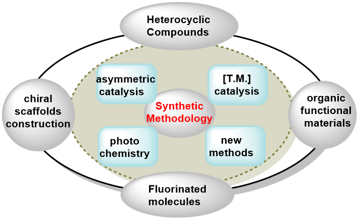 课题小组主要致力于发展后过渡金属催化以及光氧化还原催化的方法学来高效构建氮杂环化合物以及含氟化合物,探讨其潜在的生物活性。同时也致力于开发寻找新的有机功能材料。 研究方向主要包括:一、过渡金属诱导的惰性C-H键官能化研究;二、可见光诱导的有机转化;三、不对称催化合成